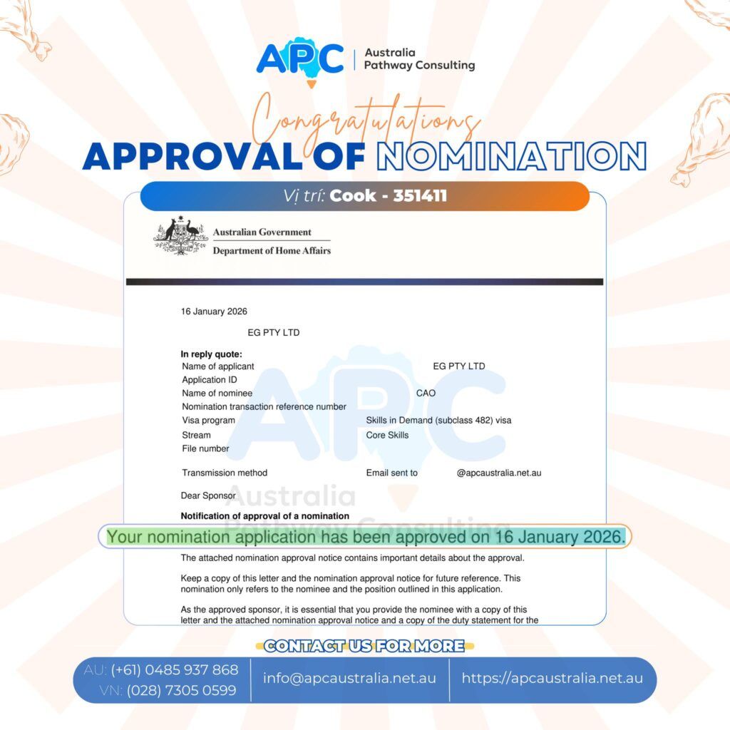 APC xin chúc mừng khách hàng C. đã nhận Nomination thành công ngành Cook (ANZSCO 351411) từ một chuỗi gà rán nổi tiếng tại Melbourne (mô hình franchise) – một case được đánh giá là có mức độ thách thức cao 👏